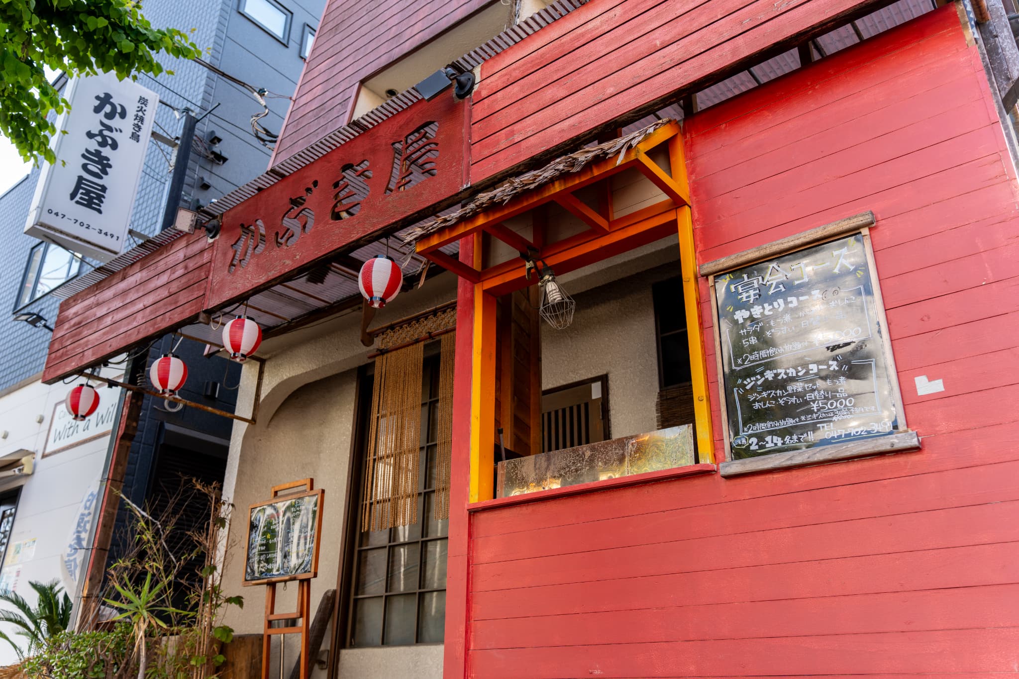 新松戸駅から歩いて約10分。 通りを一本入った先にある小さな居酒屋、それが私たち「かぶき屋」です。 外観は暖かな朱色の木造。柔らかな灯りに包まれた佇まいが、通りを歩く人の足をそっと止めます。
